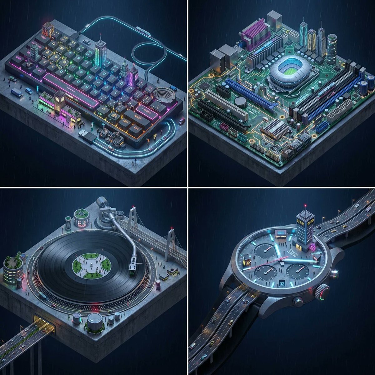 (e.g., Keyboard -> Grid of keys becomes city blocks. Record Player -> The spinning disc becomes a central park or arena. Watch Face -> A grand public square).