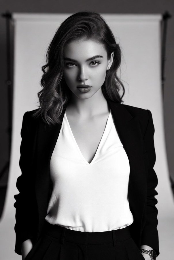 High-Contrast Black-and-White Fashion Portrait of a Stylish Young Woman