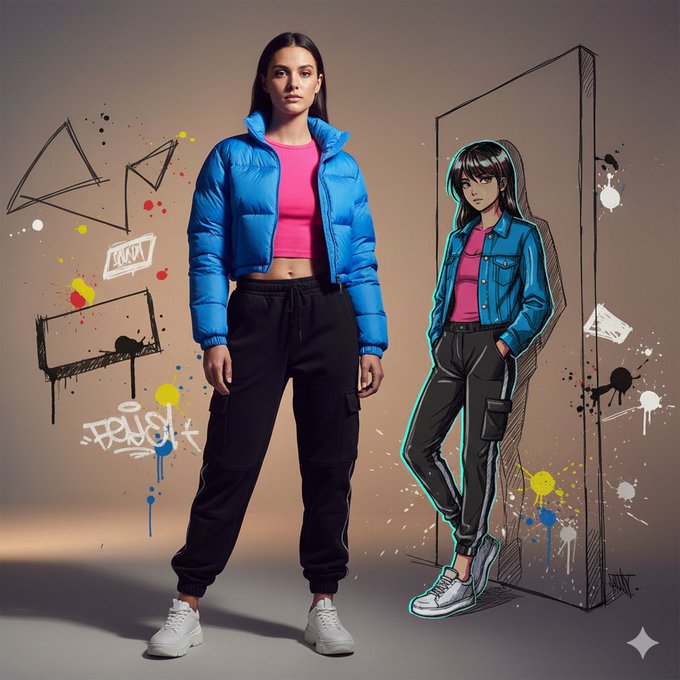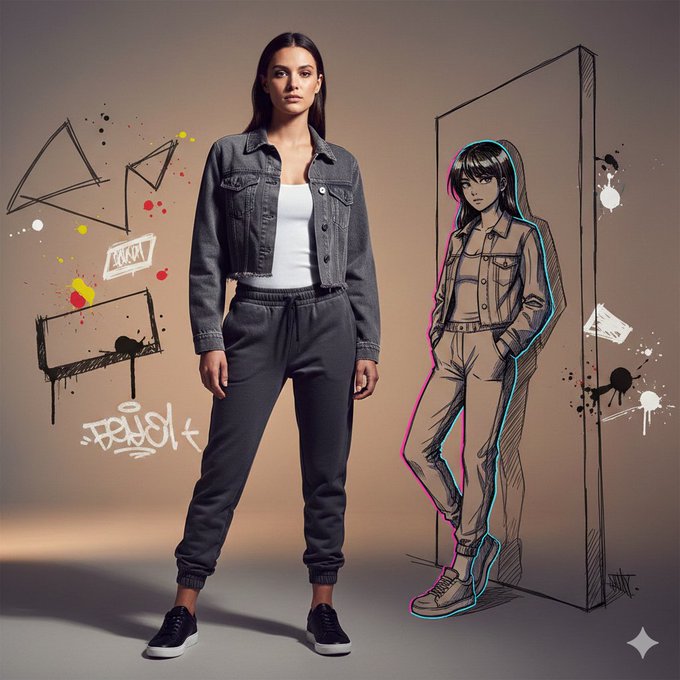"prompt": "A full-body studio portrait using the uploaded reference image strictly to preserve the original female face, identity, and facial structure (do not alter facial features, proportions, or expressions). The subject wears a steel-gray cropped denim jacket layered over a fitted white ribbed top, paired with high-waisted charcoal jogger pants and sleek black sneakers, blending raw urban energy with modern feminine street style. Natural body contours, realistic skin texture, and detailed fabric stitching are clearly visible under dramatic, harsh-edged cinematic lighting that creates bold contrast and sculpted depth. Beside the subject stands an anime-style graffiti version of her, illustrated with expressive line work, vibrant outlines, and subtle neon accents, leaning casually against an implied hand-drawn wall—merging realism with stylized street art culture. The studio environment features a warm sunrise-gray backdrop with soft sketch-like projections, paint splatter motifs, and layered graffiti textures, creating a seamless fusion of photography and illustration. Ultra-realistic, cinematic composition with editorial framing, sharp focus, high contrast, and premium studio photography aesthetics inspired by urban fashion editorials.",