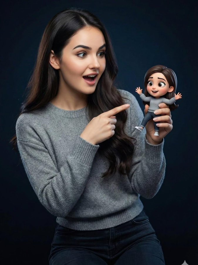 Create a studio portrait blending a real human with a tiny Pixar-style 3D cartoon version of themselves in a playful, whimsical interaction