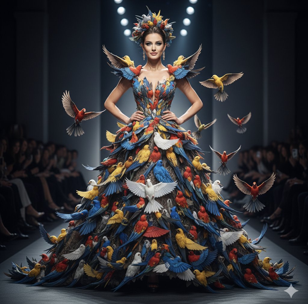 A stunning high-fashion photograph of a female model on a dark, minimalist runway. She is wearing an avant-garde gown made entirely of hundreds of realistic, colorful birds in shades of royal blue, bright yellow, and scarlet red. Some birds are perched on the dress, while others are captured in mid-flight, appearing to peel away from the fabric. The model wears an intricate, towering headpiece made of feathers and small birds. The lighting is dramatic, with cinematic spotlights hitting the model from above, creating deep shadows in the background where a blurred audience sits. The overall mood is ethereal and majestic, combining the texture of feathers with a high-end editorial fashion aesthetic.
