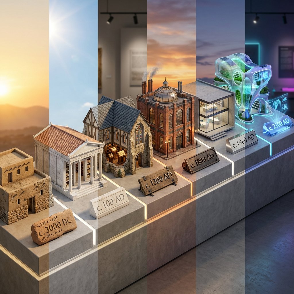 Generate a hyper-realistic, 3D "Timeline Diorama" visualizing the evolution of an Architectural Typology.