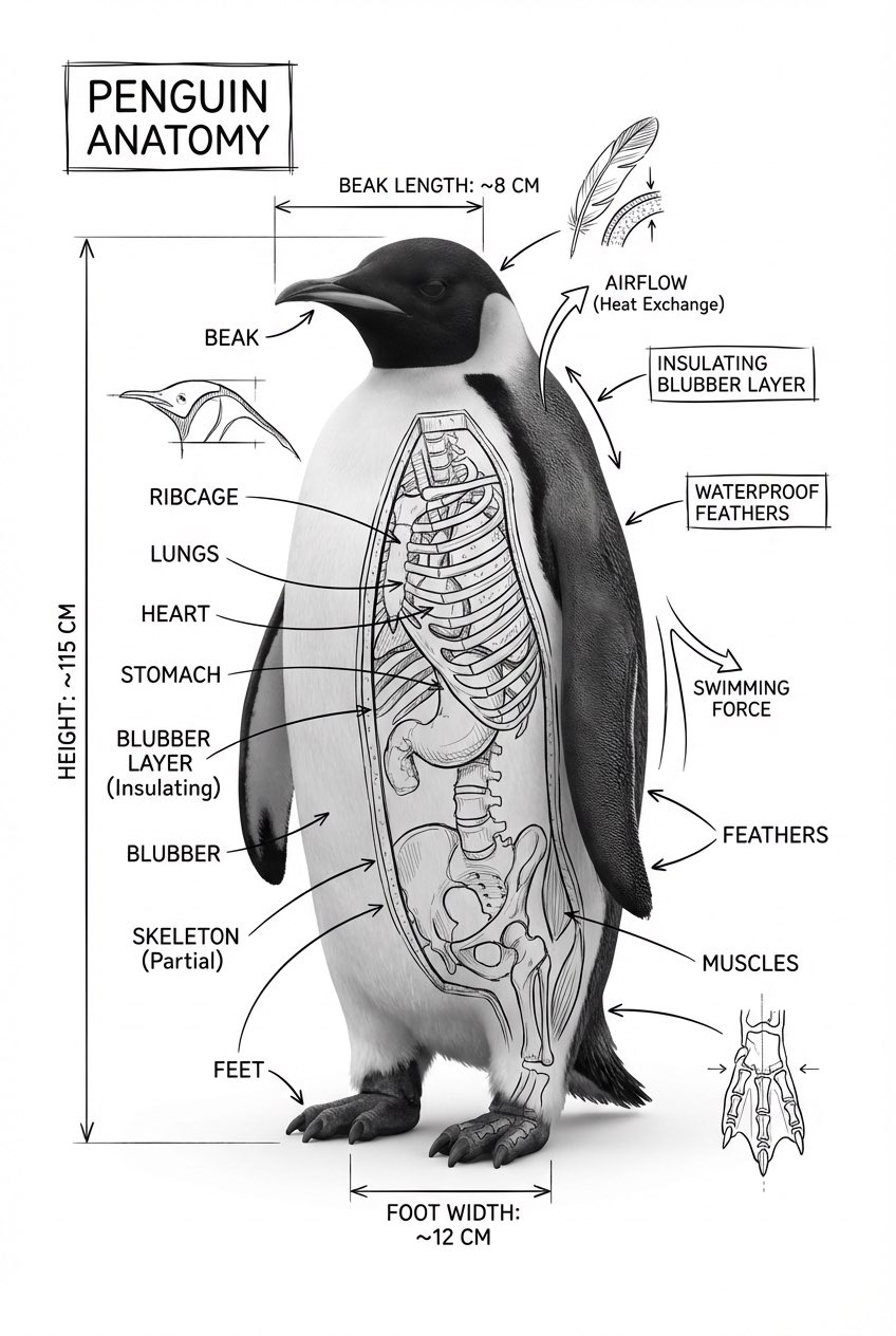 Prompt Library / Penguin Anatomy Technical Illustration Infographic