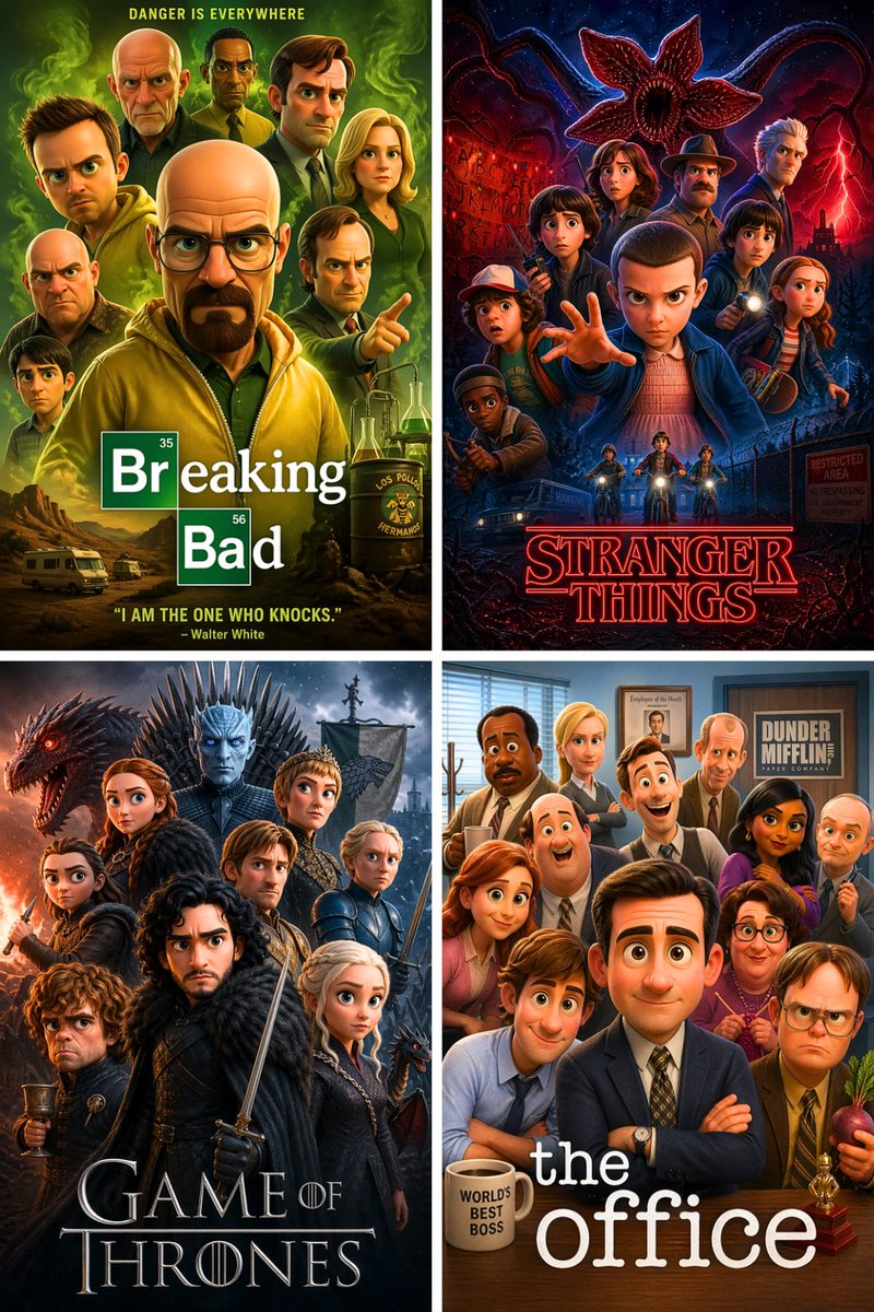 Pixar 3D CGI animated movie poster style, ensemble cast featuring the most iconic and recognizable characters from [SHOW], all rendered as Pixar-style 3D animated characters with exaggerated expressive faces, smooth stylized skin, big eyes, chunky proportions. Characters automatically selected as the most famous heroes and villains from [SHOW]. Dramatic layered composition: central hero front and center, others fanned behind in dynamic action poses. Background color automatically chosen to match the iconic tone and palette of [SHOW]. Bold title text at bottom: "SHOW" in the original film's iconic font style. Cinematic lighting, rim light on characters, deep shadows. vertical aspect ratio. High detail, polished Pixar feature film aesthetic.