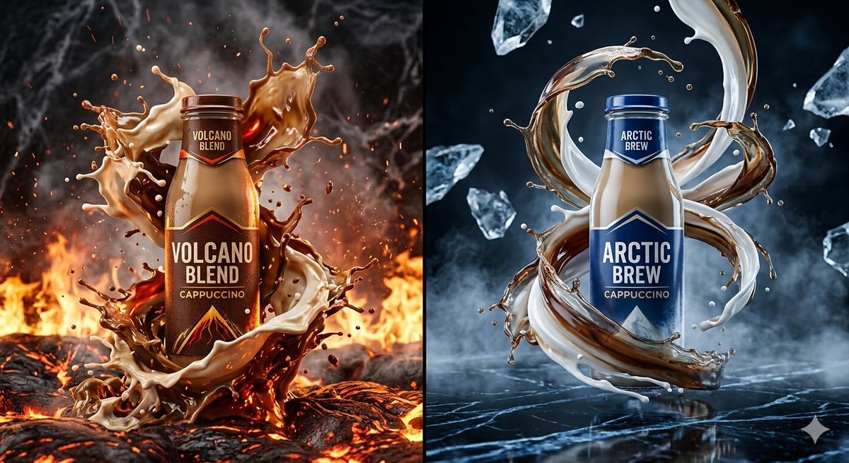 z-image presents a split-screen ad showcasing contrasting premium cappuccino bottles with volcanic and arctic themes, a visual feast of heat and cold.