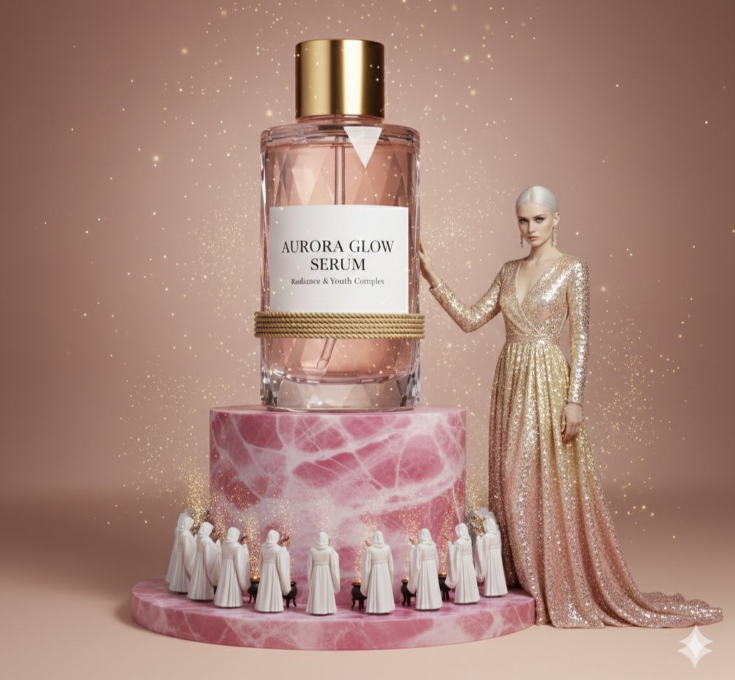 Environment: The bottle is placed on a polished dark marble surface with realistic reflections.