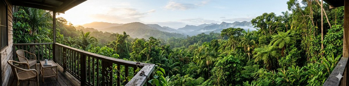 Capture the lush tropical jungle and dramatic sunset skyline with ultra-wide lens. Create photorealistic 4K images using the z-image generator.