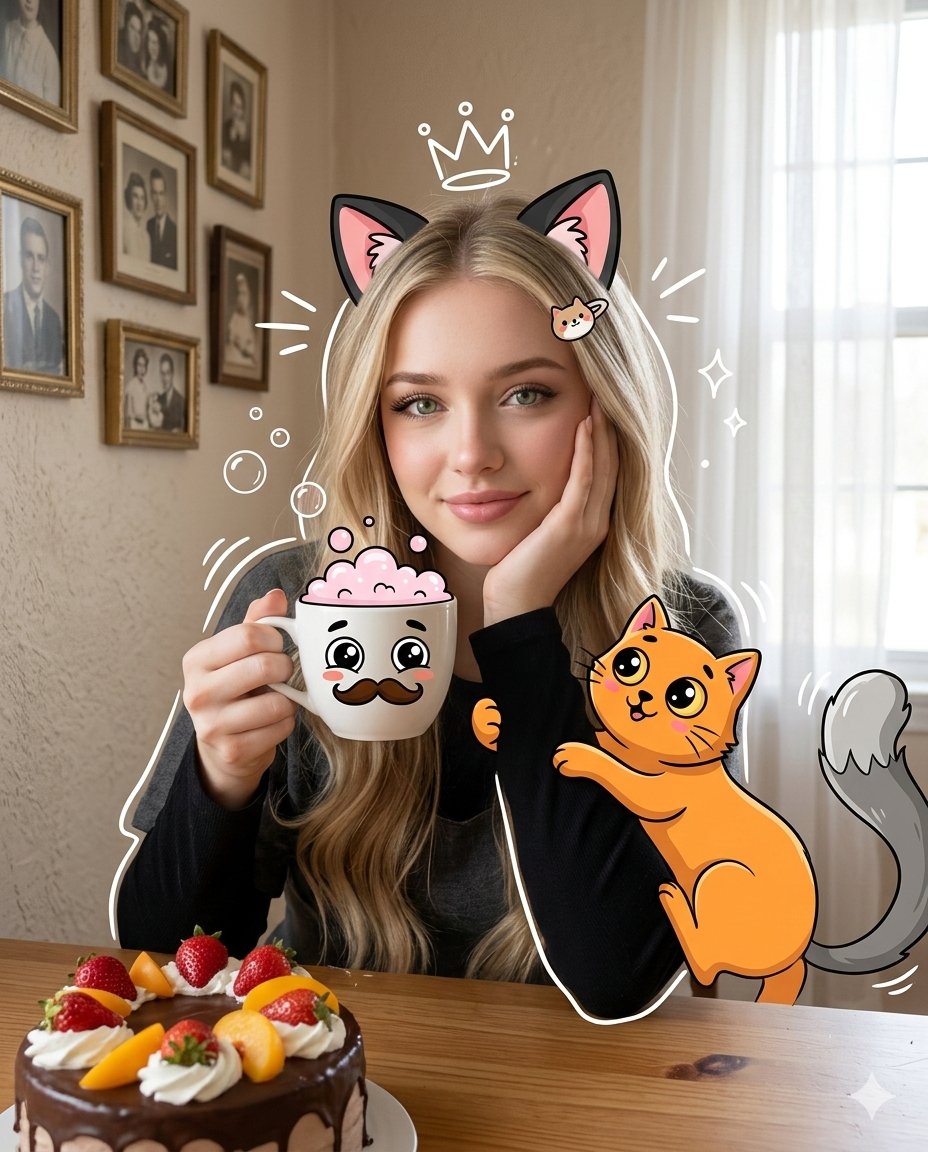 "description": "Transform the uploaded image into a 64K DSLR-quality ultra-hyperrealistic cozy, whimsical mixed-media portrait combining realistic photography with playful cartoon illustrations.",