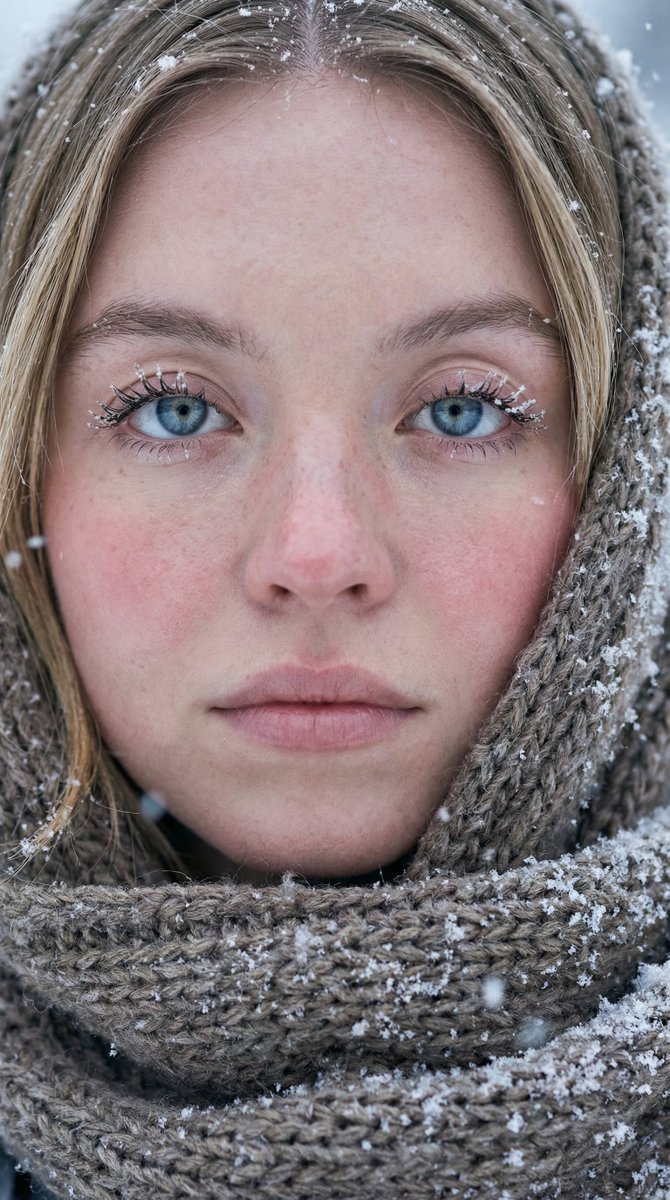 "skin": "Pale porcelain skin with visible natural texture, pores, and light freckles. Rosy flushed cheeks and nose indicating cold temperature. Hyper-realistic skin details.",