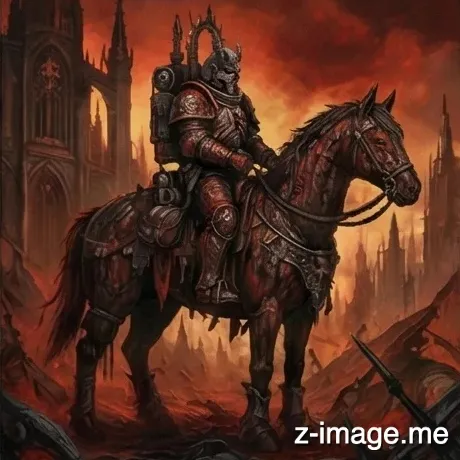 digital illustration, red yellow rust palette, apocalyptic Warhammer chaos aesthetic, scorched orange skies, baroque gothic ornamentation, sketchy chaotic brushwork, dirty parchment tones mixed with blood-red and rust, skulls and relics, ornate armor, insanity and zealotry, fever-dream battlefield energy, painterly grit and entropyप्रत्यय (Suffix)