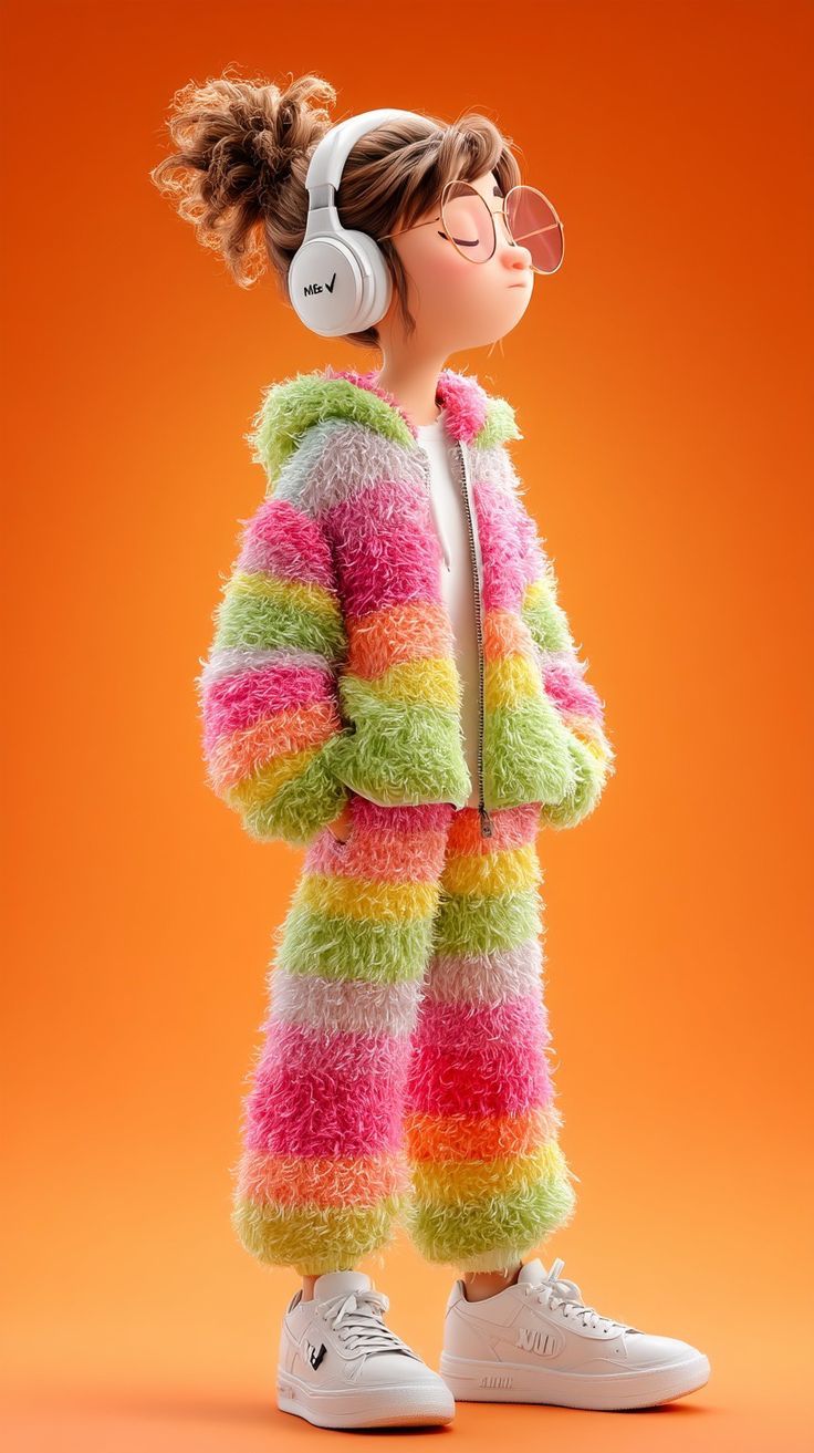 一个风格化的3D卡通人物自信地站在纯橙色背景前,穿着蓬松的彩虹条纹运动服,配有拉链夹克和配套裤子。质地超柔软且毛茸茸,色彩为鲜艳的粉彩(粉色、绿色、黄色、橙色)。角色拥有可爱圆润的脸,闭着眼睛,表情平静。头发随意扎成凌乱的发髻。戴着超大白色耳机和大圆形透明眼镜。白色厚底运动鞋,品牌标识极少。皮克斯风格比例,柔和光线,平滑渐变,高细节,电影级工作室渲染,浅景深,超干净构图,现代美学,8K质量。