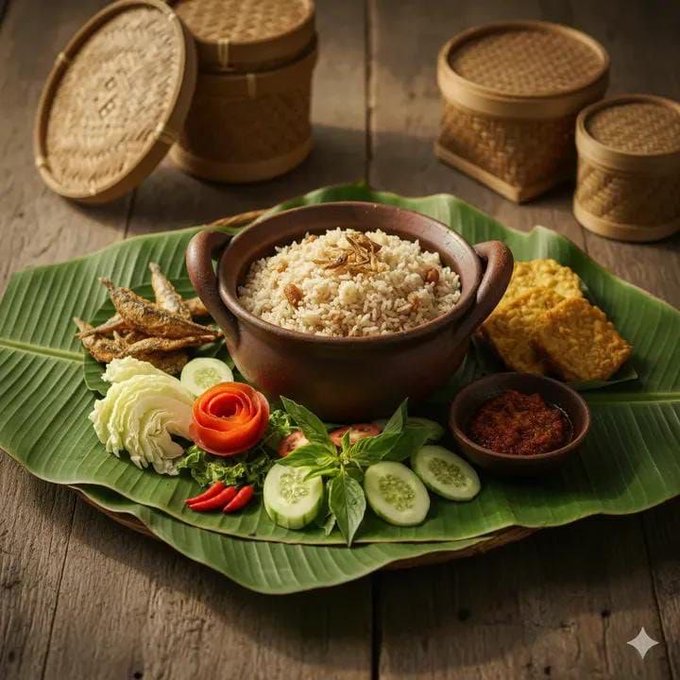 真实的印尼食物摄影,拍摄Nasi Tumpeng——圆锥形的黄米饭,周围配有炸鸡(ayam goreng)、辣炒天贝(tempe orek)、参巴辣酱和蔬菜,用辣椒花和雕刻黄瓜作精细装饰,盛放在香蕉叶上,配以编织竹托盘,背景为爪哇文化装饰,俯视平铺构图,50mm镜头,电影感暖光照明,宽高比3:2,胶片颗粒。