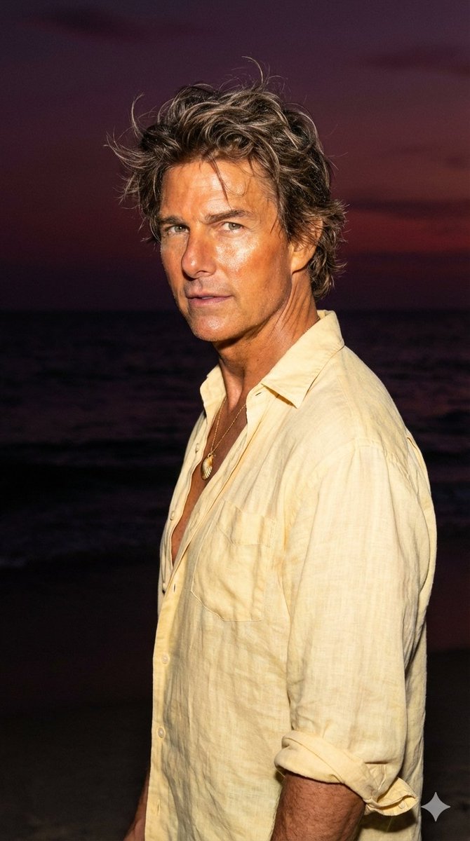 给我创建一张海滩风格的照片,就像我在一个漆黑的海滩上,有人用闪光灯给我拍照,让我的脸庞晒得发亮,略带闪光,容光焕发。背景中添加一个日落,太阳已经落下 98%,留下深紫红色的天空,几乎全黑。照片是从我背后拍摄的,我正转向镜头。我穿着一件浅黄色、宽松、半开的亚麻衬衫,袖子卷起,搭配一条精致的金色贝壳项链。我的头发被风吹乱,散发出自然的冲浪者气息。照片裁剪自腰部以上,重点突出上半身和闪耀的海滩美学。比例为 9:16。