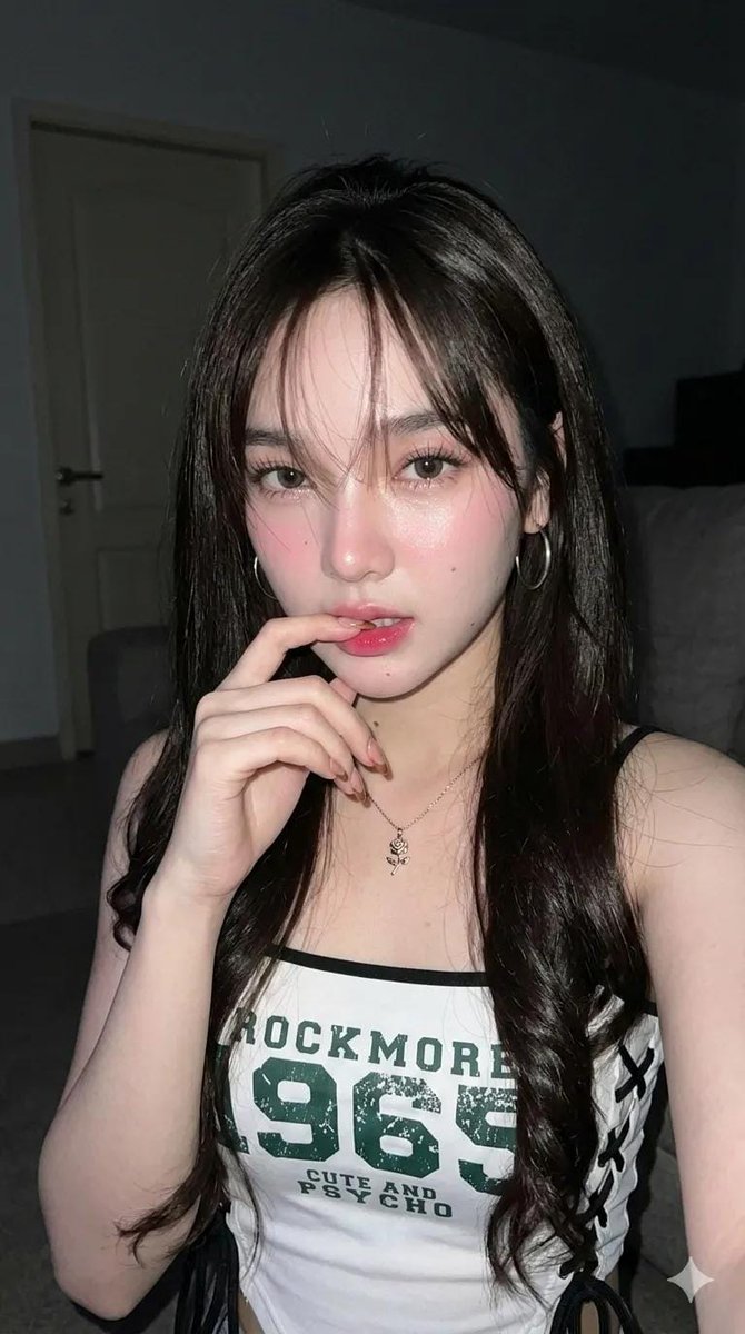 "Prompt": "创作一张美丽年轻女性的特写自拍。\n皮肤:瓷白色,明亮,光滑,且无毛孔。\n面部:对称;不要改变原来的脸。\n风格:前卫且神秘。\n姿势:站在房间里(可能是客厅)。头微微低下,看向镜头。表情平静,嘴唇微张,咬着食指。\n相机角度:低角度自拍。\n服装与配饰:\n服装:参考照片2。\n配饰:带有玫瑰吊坠的细项链;中等大小的耳环。\n指甲:浅棕色配白色指尖(法式美甲风格)。\n妆容(精细的韩式 Ulzzang 风格):\n皮肤质感:超光滑的玻璃肌,奶白明亮色调,轻薄的水光感粉底。\n高光:额头、鼻子和下巴上有柔和的高光。\n眉毛:平直,浓密自然,柔和。\n眼妆:柔和的粉桃色渐变带细微珠光;极细的“狗狗眼”眼线;长而卷翘、自然分明的睫毛。\n卧蚕:清晰且有光泽的“卧蚕”带有小高光;提亮眼下区域。\n腮红:婴儿粉色的“过度腮红”横扫脸颊和鼻梁。\n鼻子与嘴唇:小巧纤细的鼻子,轮廓柔和;“樱桃粉”光泽果冻唇,带有渐变效果(内侧颜色更深);轮廓分明的唇珠。\n表情:天真、可爱且年轻。\n头发:\n长度与颜色:极长的深褐色头发。\n质感:光滑且有光泽。\n造型:顶部直发,底部波浪/卷曲。\n刘海:法式刘海,发丝遮住她的脸,顶部略显凌乱。\n顶部有点乱\n环境与质量:\n背景:黑暗的室内环境,显示出一扇模糊的门和沙发。\n氛围:夜晚。\n光照:直射闪光灯聚焦在主体上,特别是面部,营造出明亮且发光的效果。\n技术质量:高清,8k 高分辨率。\n宽高比:9:16。\n不要改变脸部"