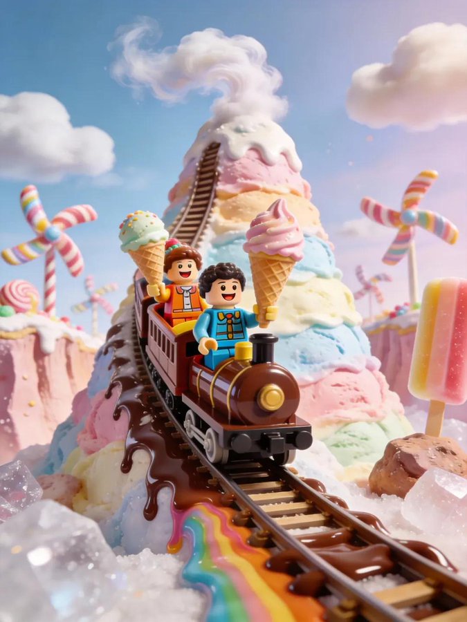 探索充满欢乐的糖果仙境,巧克力河在柔和的棉花糖山间流淌。z-image为您呈现这个充满乐趣的3D世界,乐高风格的船只和快乐的角色让美味想象成真。高品质的奇幻渲染效果。