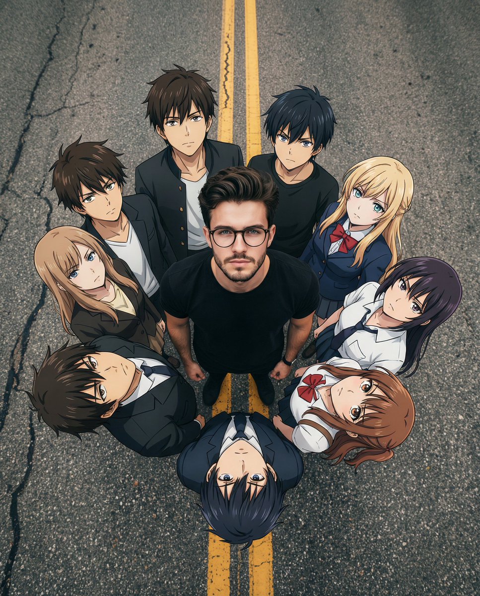 电影感动漫与现实混合风格群像俯视视角