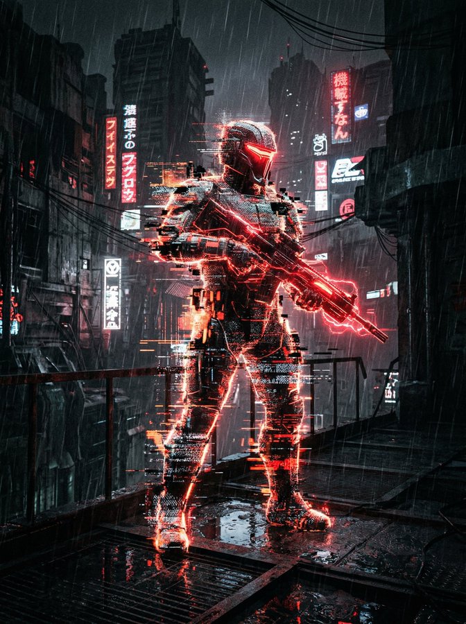 z-image呈现的反乌托邦全息幻影战士,融合故障全息与衰败都市景观,霓虹红黑调色板营造赛博朋克未来感,展现科技与衰败的强烈对比。