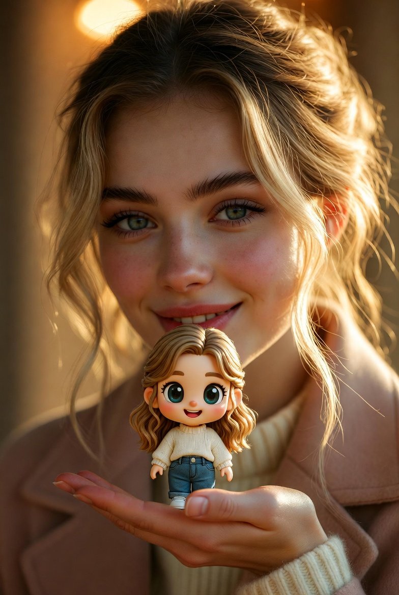 { "image_description": "一张电影感十足、细节极其丰富的肖像照,描绘了一位年轻优雅的女性。她留着柔顺的金色波浪卷发,面带微笑,手中托着一个迷你的 3D 卡通版自己。她身穿一件米色系长款大衣,内搭奶油色针织毛衣。卡通人偶完美复刻了她的造型——相同的发型、服装和颜色——但采用了皮克斯风格的可爱 Q 版设计,拥有超大闪亮的眼睛、圆润的特征和欢快的姿势。背景是一个温馨的摄影棚场景,奶油色的散景灯光营造出舒适而高级的氛围。皮肤纹理自然逼真,而卡通人偶则呈现出光滑、略带哑光的玩具质感。", "composition": { "shot_type": "中景特写", "angle": "平视,略微倾斜", "focus": "女性面部和人偶清晰对焦,背景柔和虚化" }, "style": { "overall": "写实肖像与风格化 3D 角色艺术的融合", "lighting": "柔和漫射主光,带暖色轮廓光", "colors": "暖米色、奶油色、柔和金色、柔和的马卡龙色" }, "technical_details": { "camera": "Canon EOS R5, 85mm 镜头, f/1.8", "features": "超高分辨率 8k, 电影级景深, 精致纹理" } }