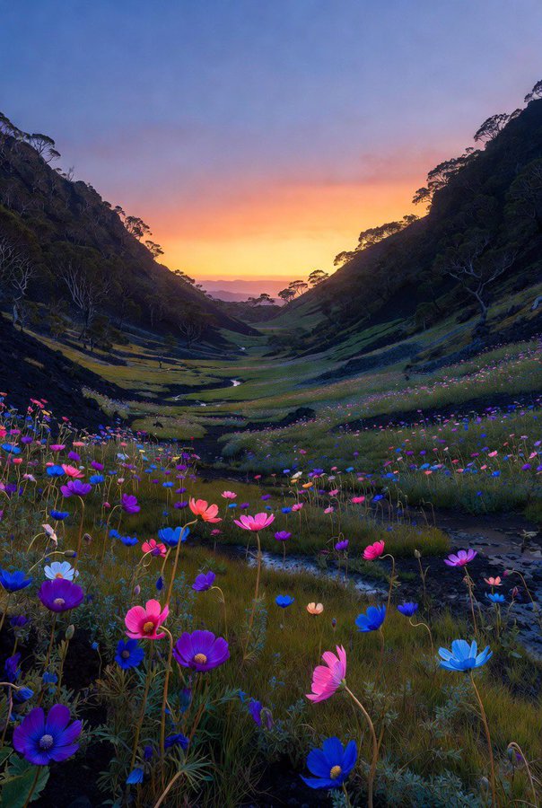 "prompt": "令人屏息的永恒春日草甸覆盖着一座休眠已久的火山口和山坡,正值黄金时刻,极其鲜艳的花朵呈现出超现实的霓虹和彩虹般的色彩——电光洋红色、发光绿松石色、紫外线紫罗兰色、发光珊瑚粉色、生物发光青色、深蓝宝石蓝色——密集地盛开在黑色火山土壤和柔和的绿草之间,柔和的薄雾在空中缓缓飘动,时间仿佛凝固在梦幻般的慢动作薄雾中,温暖的夕阳将天空染成柔和的桃色、玫瑰色和薰衣草色渐变,透过地平线上的薄雾可见远处的雪峰,浪漫而宁静的氛围,非常适合史诗般最终决战前的静静沉思或恋人的拥抱,电影级构图,超精细,空灵的奇幻风景,魔幻现实主义,超写实却又如梦似幻,丰富的色彩饱和度,柔和的焦外虚化,浅景深,8k,杰作",