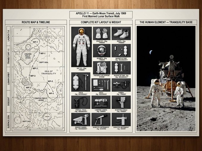 探险队领队的规划板,主题为[旅程/任务] — [目的地/时代]。左侧:带地形细节的路径地图,标注航点、危险区域,边缘附时间线。中央:完整装备布局,每件装备俯视拍照、排列整齐,标注重量与功能,冗余高亮,无多余物品。右侧:进行中的探险或已抵达的目的地,人物在景观中,建立比例,人类元素置于宏大之中。视觉风格从地图精度过渡到实用清单再到史诗环境摄影。标题栏文字"[探险名称] — [路线], [日期], [目标]"。
