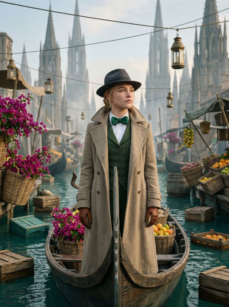 主角伫立于破旧贡多拉之上,漂流在拥挤而超现实的运河市场中,四周环绕着鲜艳的花卉与古董灯笼。背景是高耸入云的哥特式尖塔,营造出令人眩晕的垂直深度。z-image 精心打造,完美呈现哈苏相机拍摄的电影级质感与细腻光影,带来极致视觉体验。