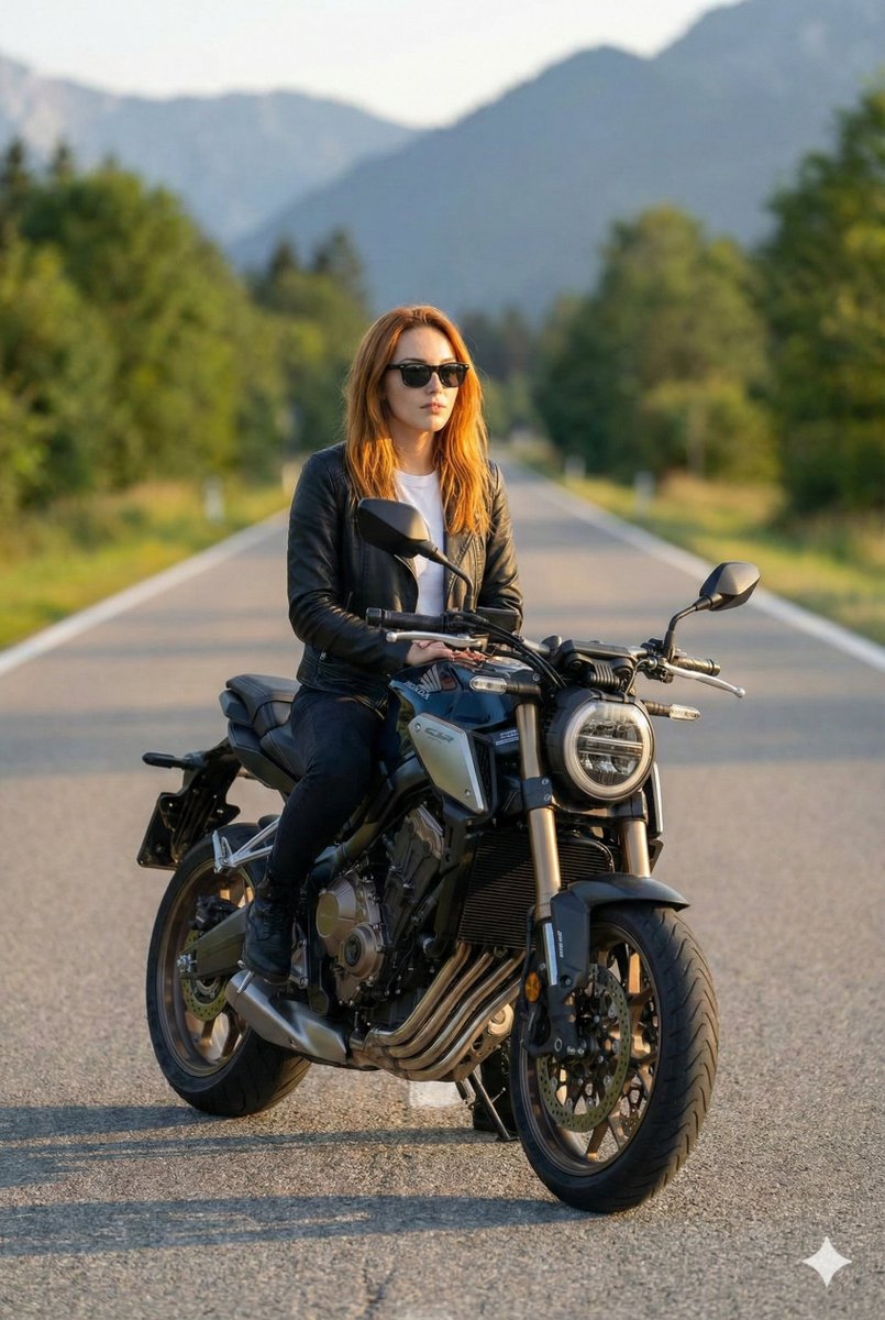 现代摩托车上的自信男士电影感肖像