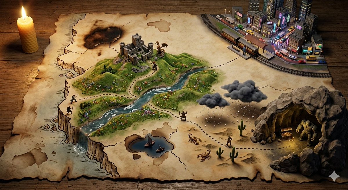 一张绘制在陈旧羊皮纸上的手绘藏宝图,冒险以三维任务的形式展开。STARTING_POINT 在地图边缘升起,伴随着 DEPARTURE_SCENE,虚线路径变成了一条真实的轨迹,穿越 TERRAIN_1,伴随着 DANGER_1,经过 {LANDMARK_1},那里有 {OBSTACLE_1} 等待着。{TERRAIN_2} 呈现出 {WILDLIFE_1} 和 {ENVIRONMENTAL_HAZARD}。标记地点“X”在 {FINAL_LOCATION} 下方闪耀,宝藏若隐若现,由 {GUARDIAN_ELEMENT} 守护着。微型探险队在路线上的各个点凝固在旅途中。地图的撕裂边缘变成了悬崖。咖啡渍变成了湖泊。烧痕变成了过去战役中焦灼的土地。烛光闪烁,冒险小说般的灯光,8K,地图本身就是它所承诺的故事。