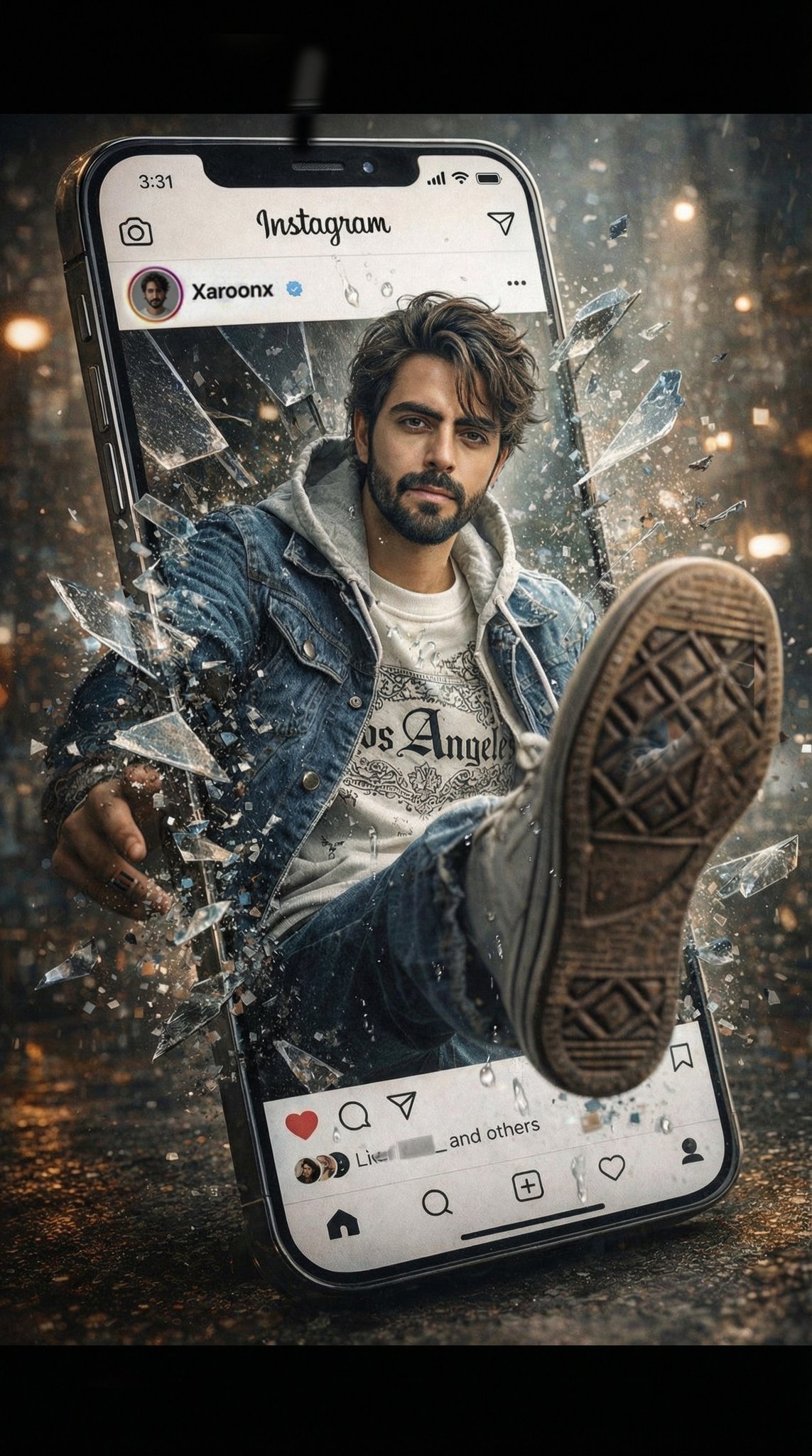 创建一个超现实电影级场景,从我自己的 Instagram 帖子中跃出。他身穿白色黑色印花卫衣和蓝色牛仔连帽衫,搭配宽松牛仔长裤,头发凌乱湿润,神情平静且带着俏皮。将其高度还原为真实应用页面,包括 Instagram 界面、我的用户名(Xaroonx)、头像照片、帖子布局和互动图标。把我放在帖子图片区域内,并重新调整身体姿势,使其看起来正从手机中走出。一条腿完全伸向观众,带来强烈的 3D 透视感。在我冲破屏幕的位置添加碎裂玻璃效果以及像素碎片。超现实光照、自然皮肤纹理、电影级景深。