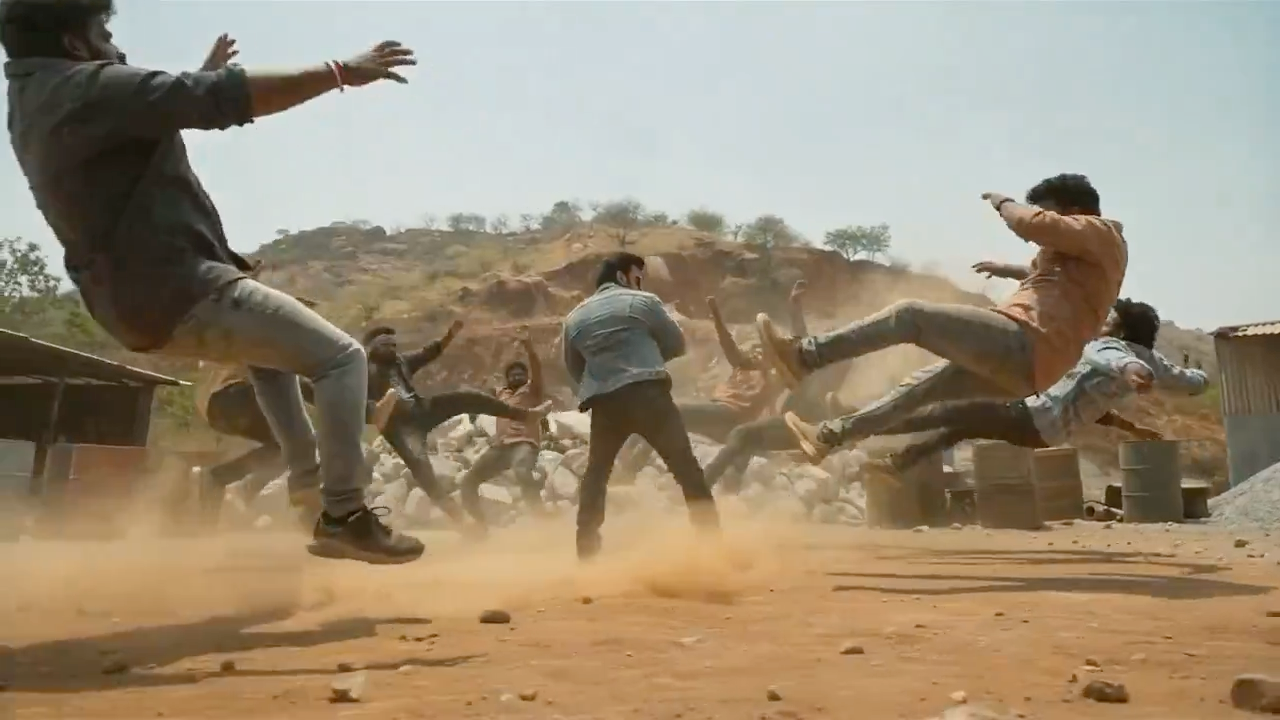 印度泰卢固语动作大片(Tollywood Action Blockbuster),极致夸张的物理特效(Anti-gravity Physics),慢动作升格与快慢镜切换(Ramp-mo),尘土飞扬,史诗感BGM氛围,无血腥,重点展示冲击力。