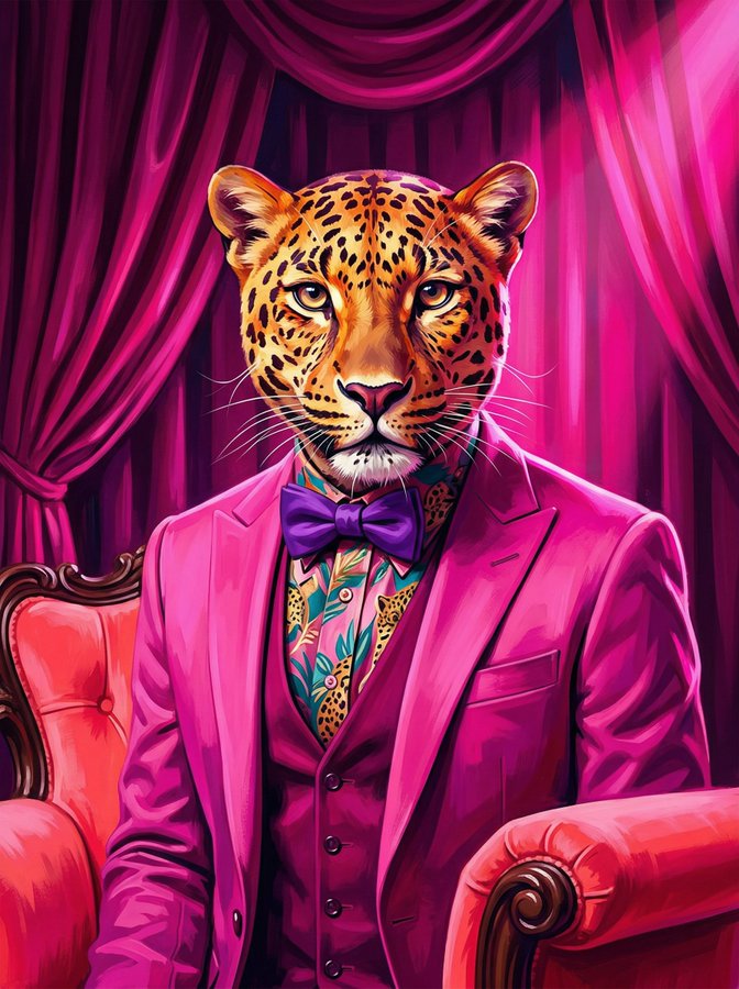 在 z-image 上体验超现实主义杰作:一只豹子穿着粉色西装,在明亮的粉色聚光灯下,背景是洋红色的窗帘。色彩鲜艳,高对比度,充满戏剧性的动物肖像。