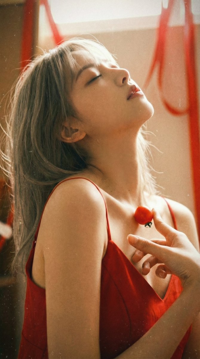 年轻亚洲女性的特写肖像,红色连衣裙,慵懒放松的夏日氛围