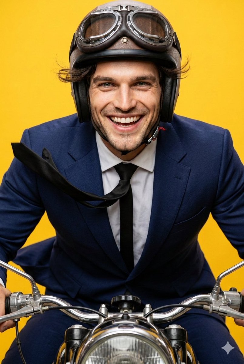 一张非常写实的照片,一个人坐在摩托车上,从正面观看。这个人穿着正式的西装、打着领带并戴着复古头盔,脸上流露出巨大的幸福感。风明显地吹向他们的脸和西装,营造出一种动态的运动感,仿佛他们正在高速行驶。整体场景应处于充满活力的黄色背景上,捕捉一个人享受摩托车骑行的真实感,清晰聚焦于面部表情和风的效果。使用佳能 EOS R5 相机拍摄,具有高分辨率和超写实的细节。