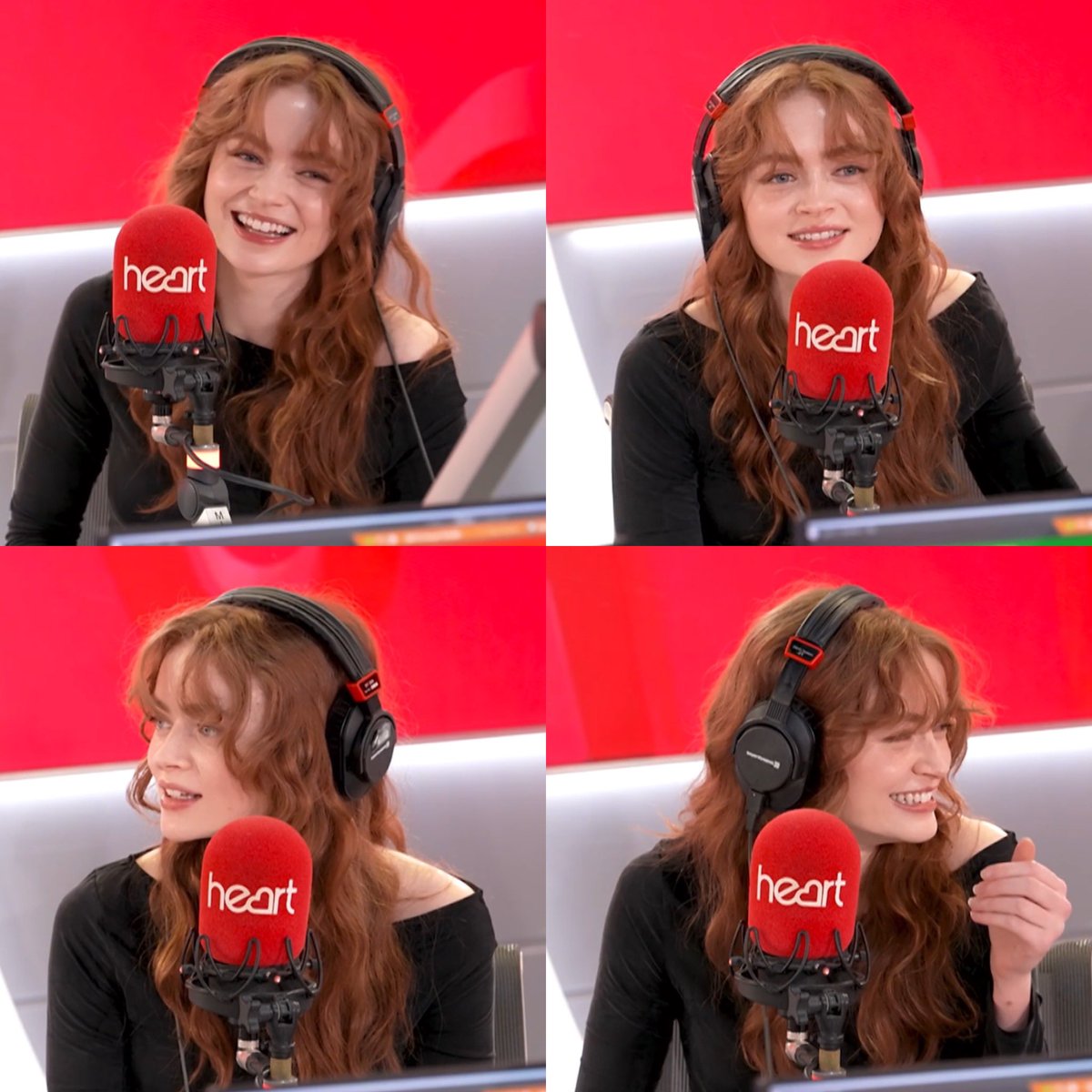 一位自信的年轻女子,留着长而飘逸的赤褐色波浪卷发,坐在充满活力的专业广播电台演播室里。她戴着时尚的黑色包耳式耳机和风格化的黑色露肩上衣,对着大胆的红色'心形'品牌麦克风说话。她灿烂的笑容和富有表现力的抓拍瞬间捕捉到了她的自然魅力和迷人的广播个性。醒目的红色演播室背景增强了充满活力、现代的广播氛围。