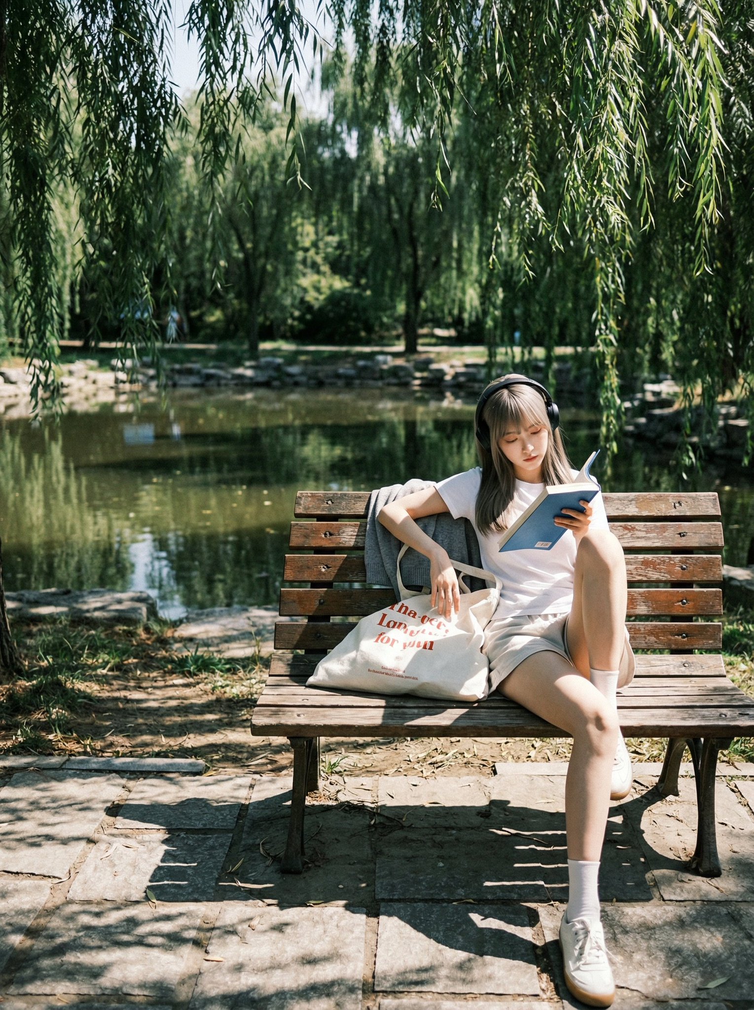 "subject": "[用户上传肖像] 摆出 [用户上传姿势],悠闲地坐在质朴的木制公园长椅上,手持一本蓝色书籍并低头仿佛在阅读,头戴罩耳式耳机,身穿休闲白色T恤和浅色短裤,一只印有红色文字白色帆布托特包放置在主体旁边,一件灰色开衫搭在长椅椅背上。",