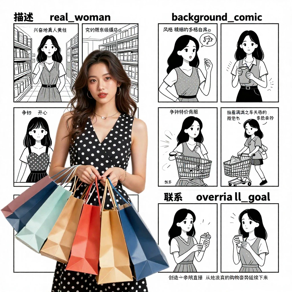 "overall_goal": "创造一个流畅的故事,让照片般逼真的女性成为她自己漫画冒险中的“真实瞬间”"