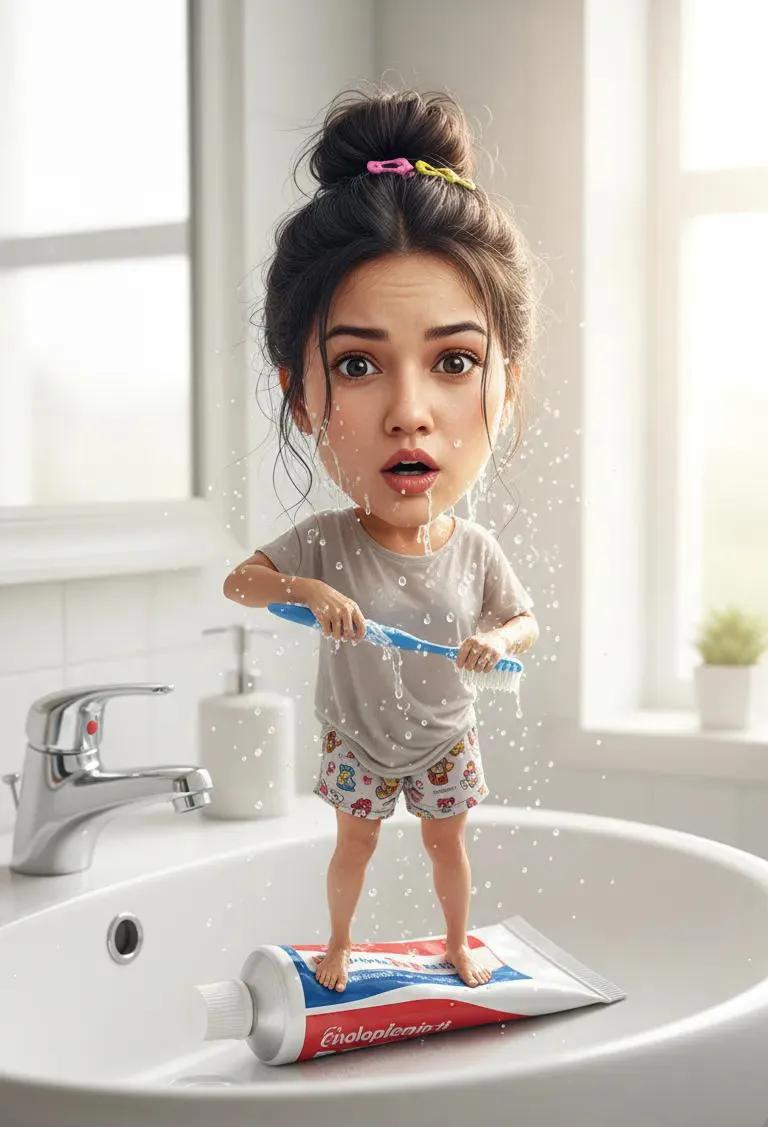 一个充满幻想的超精细3D插画,描绘了站在白色洗手盆里的可爱小女孩,她头顶巨大,眼睛明亮有神,正踩在巨大的牙膏管上刷牙,水花四溅,定格在空中闪烁的水滴中。