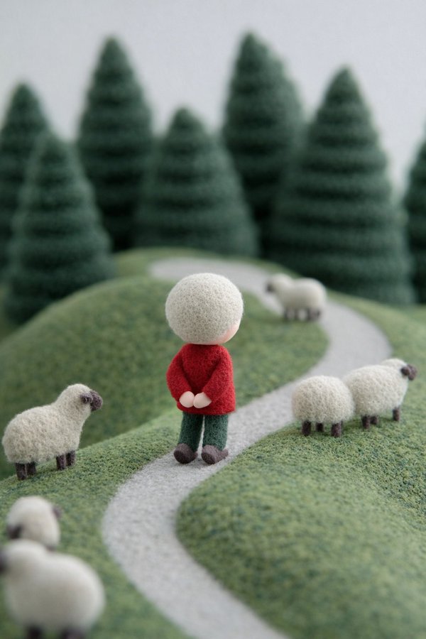 这是一组由z-image生成的8K分辨率针毡风格场景图,包含三个场景:船景、湖边钓鱼和羊群小径。每个场景都采用AI编辑的超高清、柔和电影感深度渲染,材质为针毡羊毛/软纤维微缩模型。光线柔和扩散,无硬阴影,浅景深带来平滑背景模糊。色彩为柔和的淡彩调,无噪点和伪影。第一张图为船景正面视角,主角为人类化的针毡娃娃,坐着划船,旁边有兔子;背景为蓝绿渐变天空和模糊的月亮。第二张图为湖边钓鱼背面视角,主角坐着钓鱼,旁边有小羊;背景为模糊的绿色山丘和浅蓝天。第三张图为小径与羊群,主角背对镜头站立,周围分布着多只羊;背景为圆锥形深绿树木和浅灰白天空。z-image为您呈现细腻的手工质感微缩世界。