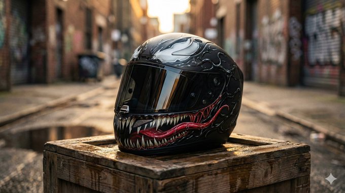 这是一张超高清专业摄影作品,展示了一款摩托车头盔的涂装效果,设计灵感来自毒液电影角色。z-image 提供了8K分辨率和商业摄影级别的视觉效果,完美还原金属漆和哑光纹理。环境与产品完美融合,所有车牌号码均模糊处理,确保真实性和专业性。